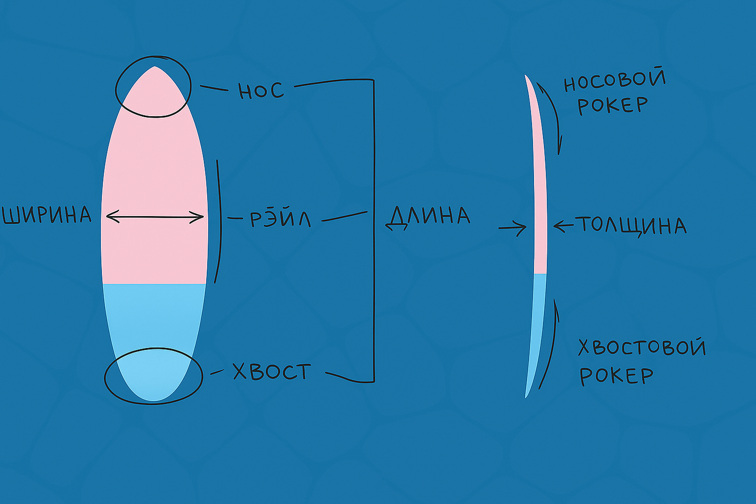 Дно доски: на днище некоторых моделей есть канавки (concaves) для отвода воды. Глубокие каналы усиливают сцепление с волной и ускоряют разгон, но снижают манёвренность (труднее выполнять вращения). Также влияют ширина носа и рисунок дна, но эти особенности зависят от конкретной модели доски.